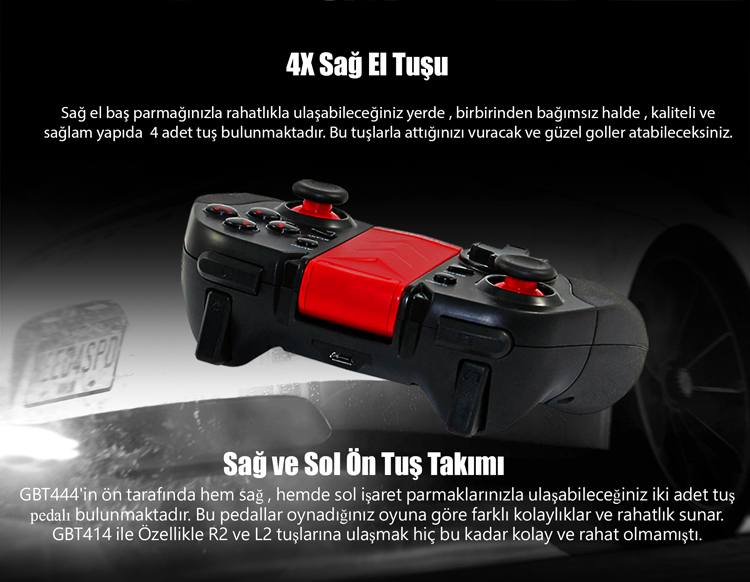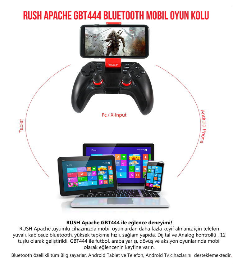 Uyumlu cihazınızda mobil oyunlardan daha fazla keyif almanız için ayarlanabilir telefon yuvalı , kablosuz bluetooth , yüksek tepkime hızlı , sağlam yapıda , Dijital ve Analog kontrollü , 12 tuşlu olarak geliştirildi. Apache Pro Gbt444 ile futbol , araba yarışı , dövüş ve aksiyon oyunlarında mobil olarak eğlencenin keyfine varın.