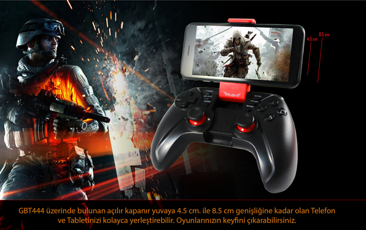 Gbt444 üzerinde bulunan açılır kapanır yuvaya 4.5 cm. den 8.5 cm. genişliğine kadar olan Telefon ve Tabletinizi kolayca yerleştirebilir. Oyunlarınızın keyfini çıkarabilirsiniz.