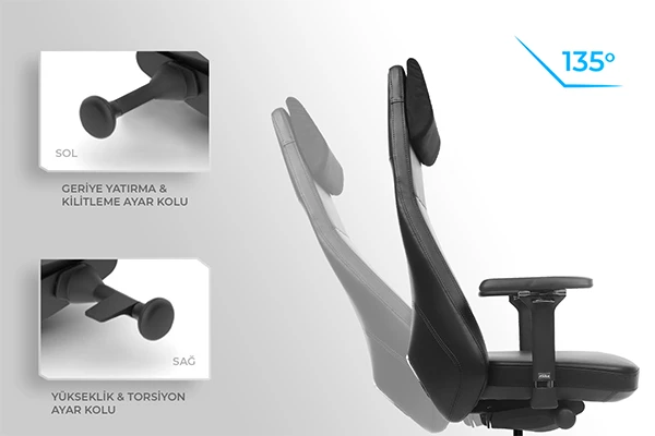 Alt mekanizmamız, 135 dereceye kadar hem oturak hem de sırtın birlikte geri yaylanma hareketini mümkün kılar. Bu yaylanma sistemi, oyunculara esneklik ve rahatlık sağlayarak uzun oyun seanslarında dahi en iyi performansı elde etmelerine olanak tanıyor.