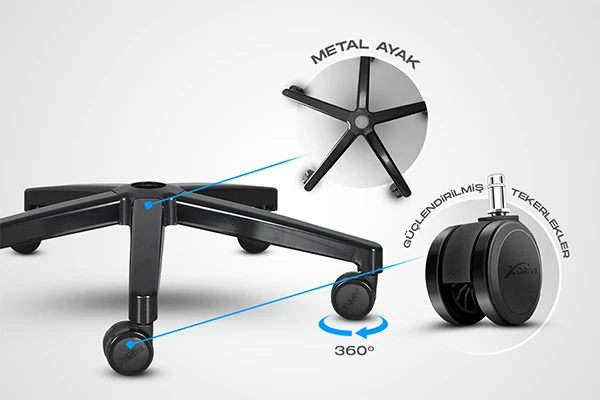 Çalışma koltuklarımızın dayanıklılığını sağlayan sırlardan biri, kullandığımız yüksek kaliteli metal ayaklarda gizlidir. Bu güçlü metal ayaklar, titiz testlerden geçerek hem yüksek dayanıklılığa hem de kullanıcı güvenliğine odaklanır. Ayrıca, ürünlerimizde kullanılan tekerlekler, yüksek kilolara dayanıklı poliüretan malzeme ile özel tasarlanmıştır. Farklı zemin türlerinde kullanıldığında çizik veya iz bırakma riskini minimize eder ve sessiz hareket kabiliyeti ile çalışma alanınızı sessiz ve huzurlu kılar. xDrive olarak, güçlü ve zarif tasarımımızla her anınıza destek olmaktan gurur duyuyoruz.